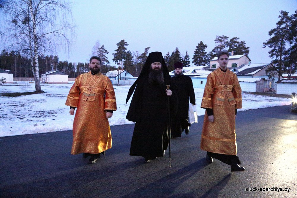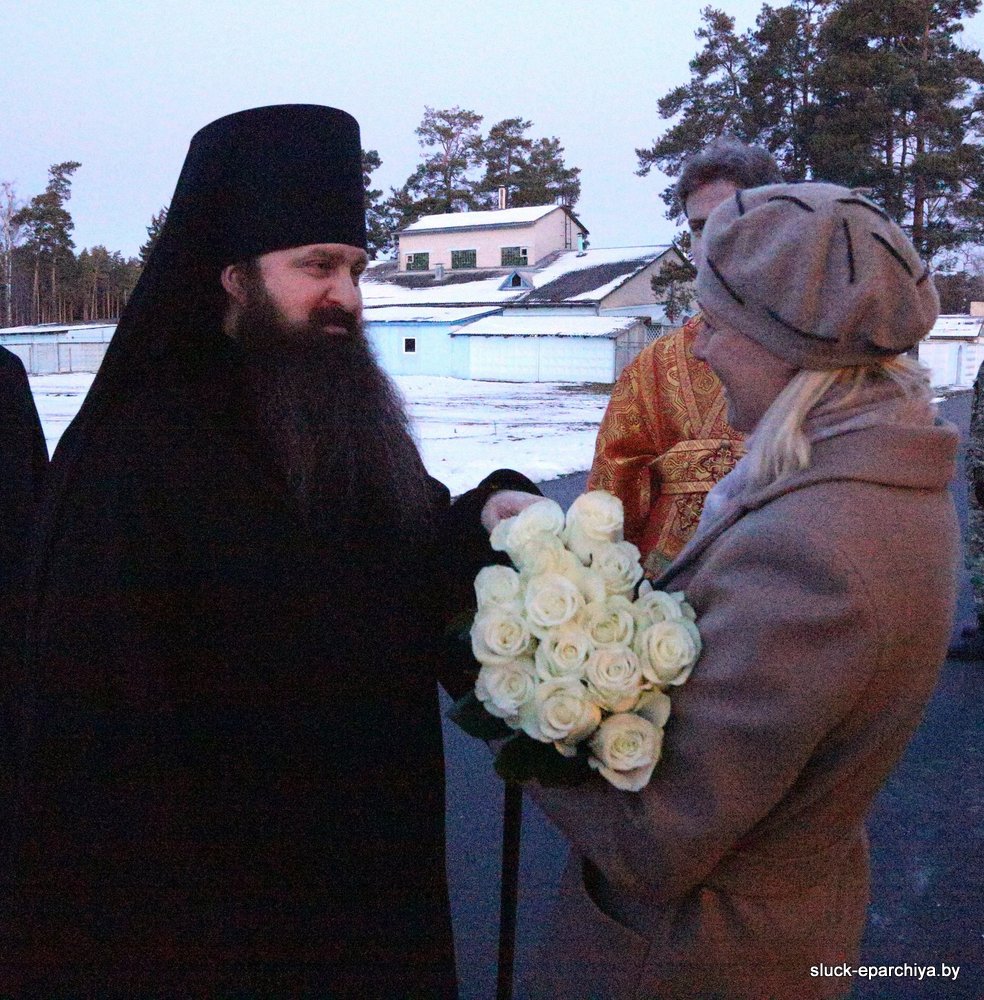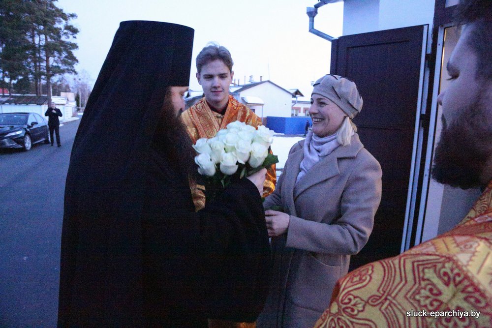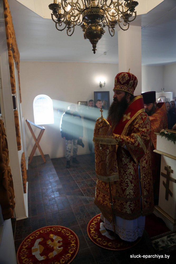 За Литургией Его Преосвященству сослужили: секретарь Слуцкого епархиального управления, настоятель прихода храма Покрова Пресвятой Богородицы в деревне Чижевичи Солигорского района протоиерей Николай Лабынько; руководитель отдела Слуцко-Солигорской епархии по взаимодействию с Вооруженными силами и правоохранительными органами, настоятель прихода храма великомученика Георгия Победоносца агрогородка Залужье Стародорожского района протоиерей Александр Пигаль; благочинный Слуцкого церковного округа, ключарь кафедрального собора Архангела Михаила в городе Слуцке, настоятель прихода храма мученика Вонифатия в деревне Павловка протоиерей Игорь Штепа; настоятель прихода храма праведной Софии Слуцкой агрогородка Вежи Слуцкого района иеромонах Серафим (Павлюченко).